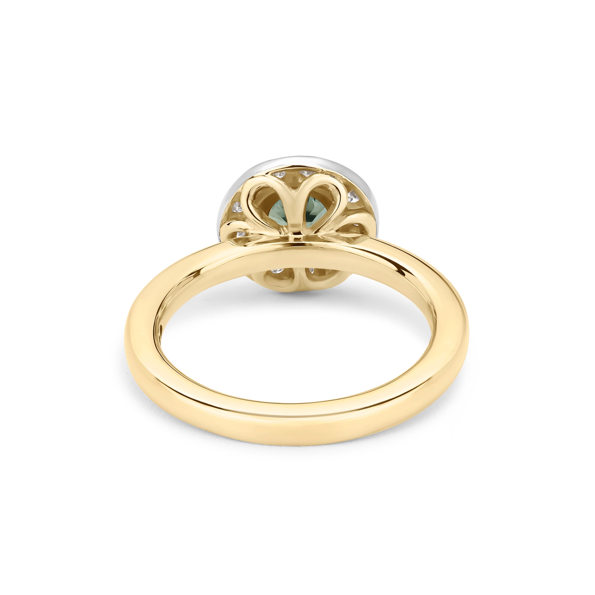 Handmade in Recycled 9ct white and yellow gold this one of a kind ring using a beautiful 4.5mm round teal coloured Madagascan parti sapphire. It is accompanied by a halo of 13 top quality diamonds (0.16ct). The ring is currently made to a size Q but upon purchase it can be resized free of charge.